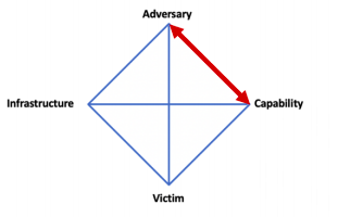 McAfee’s Diamond Model offers a holistic view of an intrusion that is a helpful guideline to shape the direction of intelligence research. By searching for relationships between two elements one can gather new evidence. For instance, by analyzing and reverse engineering a piece of malware one might uncover that a certain server is being used for command and control infrastructure, thus linking capability with infrastructure (as shown below)