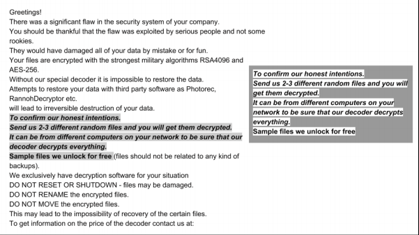 Similarities between Bitpaymer and Ryuk ransom notes have been observed before. While it is not uncommon for ransom notes to share similar language, sequences of phrases tend to remain within the same ransomware family. Slight copy+paste modifications are made to the ransom text as a variant is passed along to different groups, but large alterations are rarely made. Below is a comparison of a Bitpaymer initial email (left) and a standard Ryuk initial email (right).