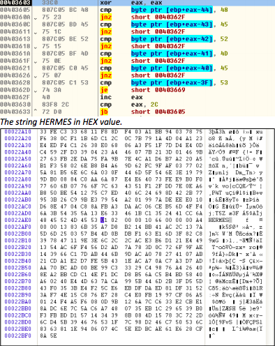 During the decryption process we have found that the decryptor searches for the known file marker string HERMES which is located in the encrypted file.