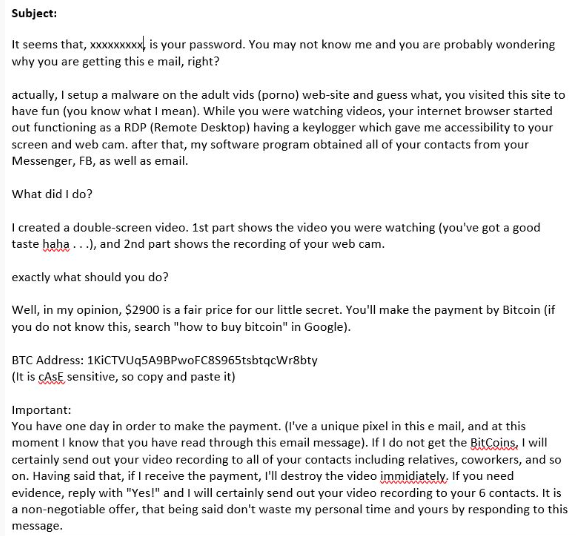 The criminals are using a combination of the law of averages, and some topical information to convince an individual person that they have been hacked and the sensitive images and video are in the hackers position. There are 3 elements to this: